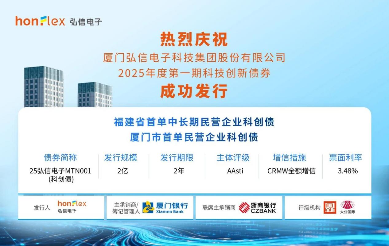 12月11日,厦门弘信电子科技集团股份有限公司在银行间市场成功发行“厦门弘信电子科技集团股份有限公司2025年度第一期科技创新债券”,发行金额2亿元,期限2年,由厦门银行牵头主承销、浙商银行联席主承销,并创设信用风险缓释凭证(CRMW)为本期科创债增信。